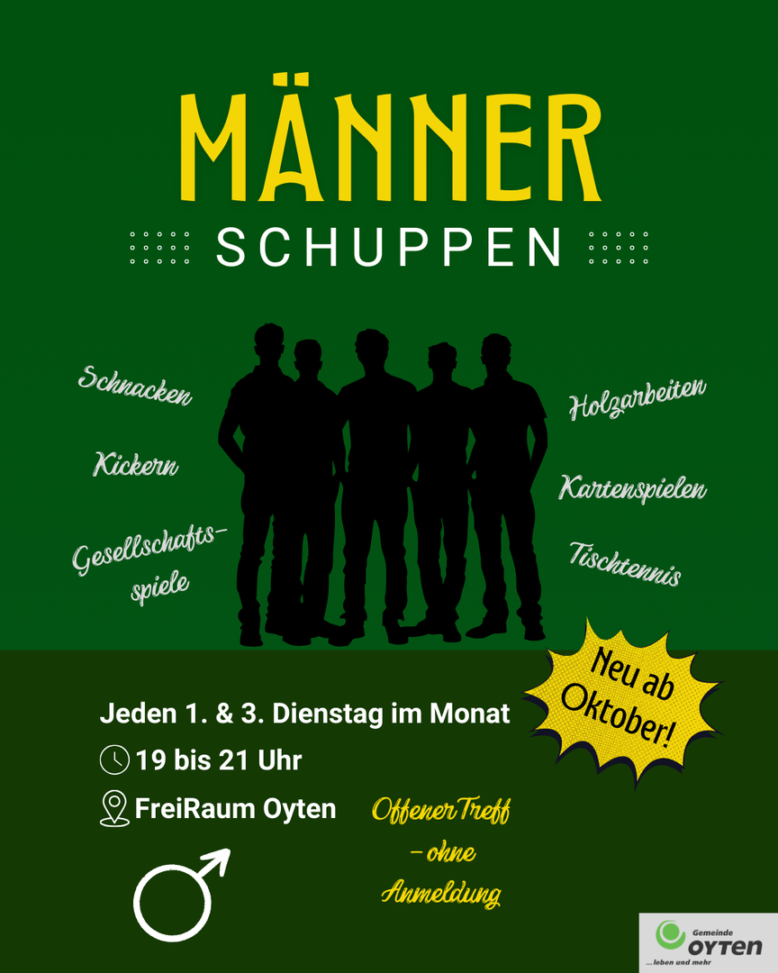 Jeden 1. und 3. Dienstag im Monat von 19:00-21:00 Uhrsind Männer recht herzlich eingeladen sich im FreiRaum der Gemeinde Oyten zu treffen um gemeinsam zu kickern oder